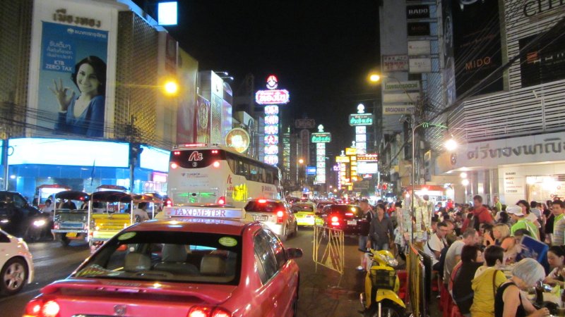 Ech, dzisiaj jest środa, więc wypadałoby napisać, co działo się w niedzielę, poniedziałek, wtorek i dzisiaj. Może poskładam to w jakąś większą całość. Jest tutaj tak gorąco, że właściwie żyć zaczynamy dopiero około 18, kiedy słońce przestaje grzać. Próby przeniesienia się na tryb dzienny kończą się bardzo źle: przegrzaniem i – co najgorsze – chorobą. Klimatyzacja tak potrzebna w tym rejonie jest jednocześnie dla nas zabójcza. Idąc po ulicy-patelni wchodzisz na chwilę do jakiegoś sklepu i buch! Ściana dwudziestostopniowego chłodu, 5 minut i buch! Znowu skwar. Niestety nie da się dłużej funkcjonować nie ochładzając się czymkolwiek, więc  po kolejnych 15 minutach znowu wchodzisz kupić coś schłodzonego i sytuacja się powtarza. Jeśli coś do picia, to tylko z lodem. Gardziołka bolą nas nieustannie, mi jeszcze doszedł ból głowy, ale odpukać, od kiedy nie łazimy jak wariaci w południe po mieście, sytuacja uległa poprawie. Zaczęliśmy zużywać zapasy leków jeszcze polskiego pochodzenia. Życie trybem nocnym zostało chyba z góry ustalone jeszcze przed naszą decyzją. Zmienialiśmy guest house’y już 4 razy, za drugim razem dlatego, że pod nami była impreza całonocna. Niestety zasnęliśmy dopiero nad ranem, więc i obudziliśmy się później. Kolejnego dnia poszliśmy do klubu jazzowego, znowu zasnęliśmy nad ranem, i sytuacja się powtarza. Doszło do tego, że dzisiaj gdyby nie odezwały mi się smerfy w telefonie, że brukselka jest do zebrania, spalibyśmy do pierwszej. Niestety Bangkok bez dostępu do wybrzeża również nie zachęca. Atrakcje są, a i owszem, ale raczej dla tzw. sex turystów. Lepiej nie drążyć tematu, bo można dostać urazów psychicznych. Jednak w ciągu tych kilku dni udało nam się coś zobaczyć, coś poznać, zjeść kilka dobrych posiłków.