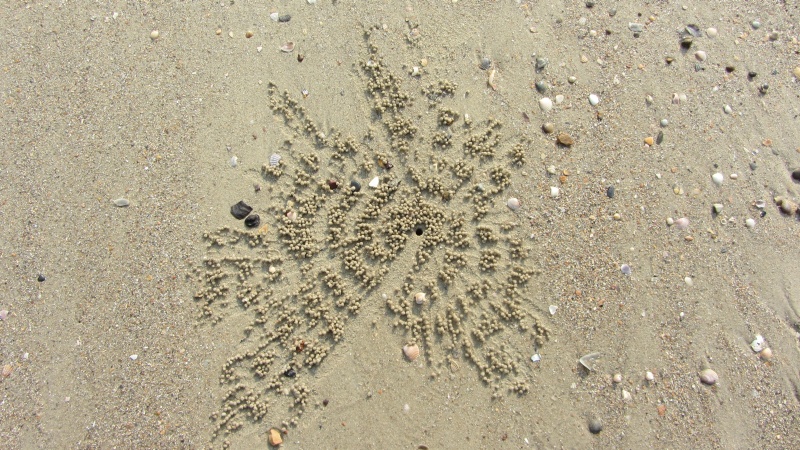 Rajskich rozrywek ciąg dalszy… Zacznę może od wielokrotnie wałkowanego już tematu, ale ciągle aktualnego i interesującego, czyli od krabów. Ich mieszkanka wyglądają dosyć specyficznie. Malutkie krabiki kopią sobie tunele w piasku, mozolną pracą wyciągając piasek na zewnątrz w postaci kulek. Na zdjęciu przykładowe otoczenie wejścia do norki. Krab rozpoczyna od zrobienia ścieżki „autostrady” i układa po lewej kulki coraz dalej promieniście od norki. Ten na zdjęciu układa po prawej stronie tworząc gwiazdę przeciwnie z ruchem wskazówek normalnego zegara, a zgodnie z ruchem wskazówek z zegarem wiszącym w naszym mieszkaniu we Wrocławiu. KuleczkiPróbowałam robić statystyki i dowiedzieć się, czy kraby preferują ten kierunek, czy przeciwny. Wynik: nie można tego jednoznacznie stwierdzić, proporcja to pół na pół. Dużo kuleczekSą też kraby wodne, które atakują ślimaki z muszlami podobnych do siebie rozmiarów i kradną im domki. Takie kraby łatwo wpadają w ręce Jacka, który każdego z nich przynosi na kocyk i fotografuje ze wszystkich stron. Tu kolejny pechowiec.Krabik