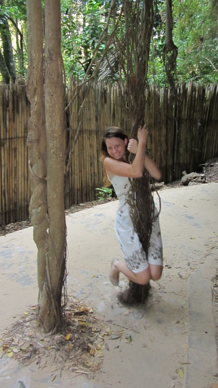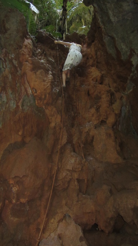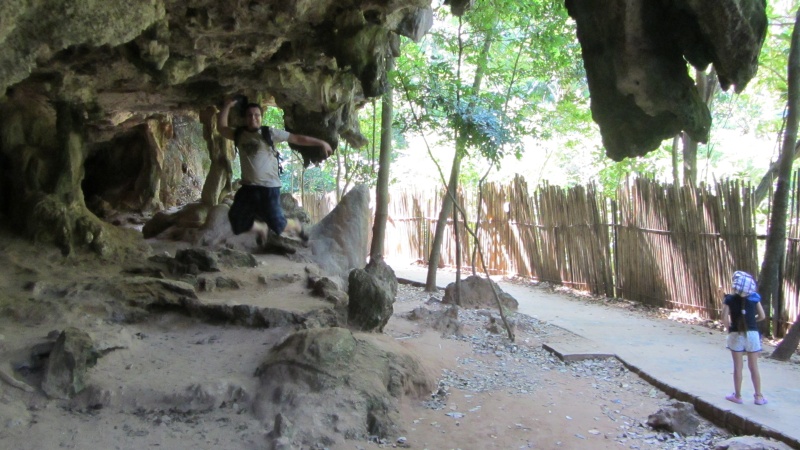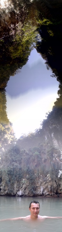Na miejscu trochę pochodziliśmy po okolicy, przeszliśmy się uroczą trasą tuż przy skale, oglądając twory skały wapiennej i zwisające liany. Bawiliśmy się w najlepsze… SłupTarzanka Uwaga na głowę…aż zmroziło nam krew w żyłach, kiedy zobaczyliśmy tę „ścieżkę”. Właściwie to była prawie pionowa skała z dołączonymi lianami i zwykłymi linami do chwytania się i podciągania do góry. Zrozumiałam, że wybór białej sukienki na ten dzień nie był wyborem trafnym, ale nie było już odwrotu. Wspinaczka MasakraSzliśmy (a raczej wciągaliśmy się) w górę, dotarliśmy na punkt widokowy, potem znów w dół. Widok z góryPo kilku (dla mnie) sytuacjach kryzysowych (gdy wiem, że nie mogę iść ani do przodu, ani do tyłu, stan znany mamie A i od dzisiaj też mnie), dotarliśmy do niezwykłego miejsca. Małe jeziorko z trochę zamuloną od wszechobecnej gliny, ale jednak czystą wodą otoczone pionowymi wapiennymi skałami. Zupełnie odcięte od świata. Jaka tam akustyka była! LagunaOko W okuSzybciutko wskoczyliśmy do wody, aby zmyć z siebie pot i glinę, i tak przez kilka minut rozkoszowaliśmy się tym uroczym miejscem. Droga powrotna była równie męcząca i mozolna, ale powtarzając za shrekowym osiołkiem „już znam tę połowę”, poszło bez „ochów” i „achów” z mojej strony.Żaglomaszt drzewny Tu bylymyNie będę wredną i nie napiszę, że resztę dnia spędziliśmy w wodzie na bajecznej plaży nurkując, obserwując resztki rafy koralowej i trzymając małą rybkę na języku (Jacek! Jak mogłeś!) wiedząc, że w Polsce jest minusowa temperatura i pada śnieg, a fotoradarów przybywa jak grzybów po deszczu. Chodzi po wodziePocztówkaDlatego opanuję się i wrzucę lokalną ciekawostkę: co znaleźliśmy w spożywczym. Tajski przysmak