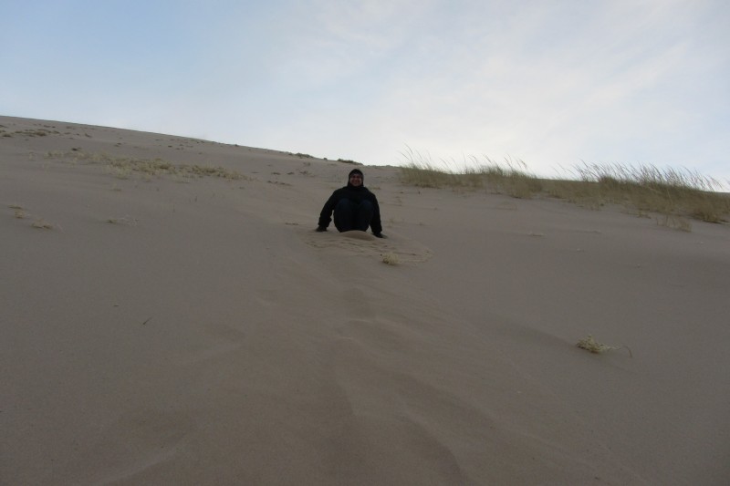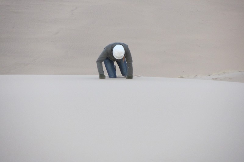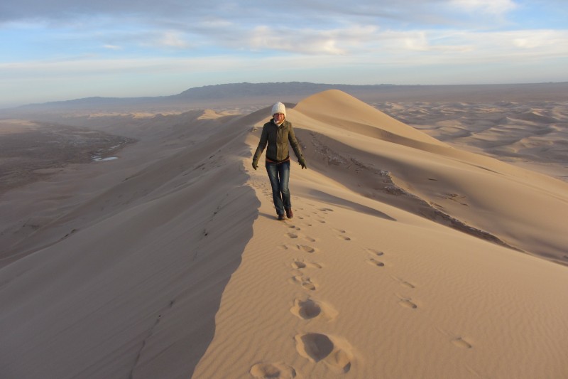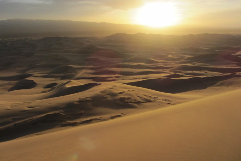 A przed zachodem słońca pojechaliśmy jeszcze na pobliskie wydmy, żeby wspiąć się na najwyższą z nich. Trzeba przyznać, że ciężka to wspinaczka, kiedy za każdym krokiem posuwasz się do przodu o 10-20 cm, ale po 45 minutach dotarliśmy na szczyt. Widok na góry, wydmy i zachód słońca zapierał dech w piersi!